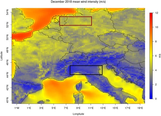 December 2018 average wind speed. The two areas (boxes) selected for the experiment are the Po Valley flat area and Northern–Central Europe area.