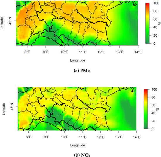 The topographical characteristics of the Po Valley strongly influence the local meteorology, leading to the typical climate of the region [,] characterized by low winds, particularly weak in the winter months, with average speeds that are among the lowest in comparison to the rest of the European continent. In the Po Valley, due to the average weakness of the wind speed, the most important contribution to vertical mixing in the PBL (Planetary Boundary Layer) comes from the thermal component (vertical overturning due to buoyancy, mostly in summer and intermediate seasons). On the contrary, during wintertime, there are frequent thermal inversion conditions near the ground, particularly at night. This creates a single layer of diffuse and uniform pollution in the lowermost portion of atmosphere. Under these conditions, which can sometimes persist throughout the day, the dispersion of pollutants is severely hampered, with the primary pollutants tending to progressively accumulate near the ground, reaching high concentrations, and therefore favoring the formation of further secondary pollution. During these episodes, pollution is no longer limited to urban and industrial areas, but homogeneous high concentrations are recorded throughout the basin, including in rural areas, far from the emission sources. These explains why in the Po Valley the concentrations of most pollutants show a marked seasonal cycle, with winter values much higher than summer values, which in turn explains why almost all exceedances of LV occur in winter.