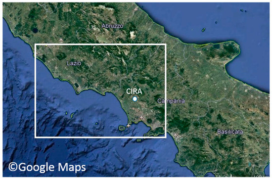 The computational domain considered, including northern Campania and southern Lazio regions. The Italian Aerospace Research Center (CIRA) site is specified.