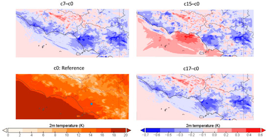 Even if observational data are not available over the whole domain, it is interesting to analyze how the sensitivity configurations modify the distribution of temperature with respect to the reference one. Figure 4 shows the T2m distribution related to 5 November 2017 at 6.00 (hour 54, corresponding to a minimum value) for the reference configuration c0 and the differences of distribution obtained with configurations that have been proven to produce better improvements (i.e., c1, c7, and c17) with respect to the reference one. The CIRA site is highlighted with a blue dot. From the data already discussed, it shows that c0 generally overestimates the minimum temperature. The maps of Figure 4 highlight that c7 and c17 provide lower values over the whole domain (generally reducing the bias), while with c1 benefits are confined to smaller areas, close to the CIRA site. Similarly, Figure 5 shows the T2m distribution related to 3 November 2017 (mean value) for c0, and the difference of distribution obtained with c7, c15, and c17 with respect to the reference one. As already said, c0 overestimates mean T2m of about 1.2 °C at the CIRA site, but the other three configurations are able to reduce significantly this bias. A reduction of temperature is observed over the northern Campania region (eastern part of the domain), while warmer temperatures are recorded in the northern part of the domain, over the sea and along the coastal area.