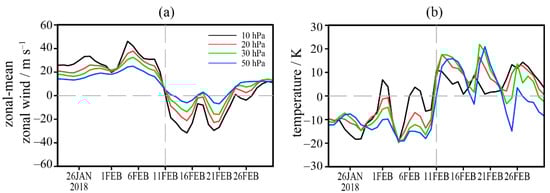 Figure 1 shows temporal evolutions of the following factors from 22 January to 3 March 2018 (20 days before and after the occurrence of the SSW): the zonal-mean zonal wind in the stratosphere (50–10 hPa) averaged in 60–75° N, and the temperature gradient between 60° N and 90° N (the temperature at 90° N minus the zonal mean temperature at 60° N). It can be seen that in January, a westerly wind is found, and the temperature at the North Pole is relatively low, indicating that the polar vortex is relatively strong. The zonal westerly wind weakens a little at the end of January. Meanwhile, the sign of temperature gradient is reversed for the first time at 10 hPa, which denotes a minor warming event (Figure 1a). The zonal westerly wind strengthens subsequently, reaching the maximum wind speed of 47 m s−1 on 4 February, and then the zonal westerly begins to weaken rapidly. The zonal-mean zonal wind at 10 hPa changes from westerly to easterly on 11 February, and the easterly wind last for 15 days. The wind speed weakens by about 60 m s−1 compared with the maximum wind speed. Although the easterly wind weakens again 5 days after the reversal of wind direction, it does not turn to the westerly. The temperature gradient in the stratosphere also changes from negative to positive during 10–11 February (Figure 1b). In spite of the fluctuation afterwards, it remains positive. Thus, according to the definition of SSW given by the WMO, this SSW event is a typical major warming event with the central date or so-called onset date on 11 February.