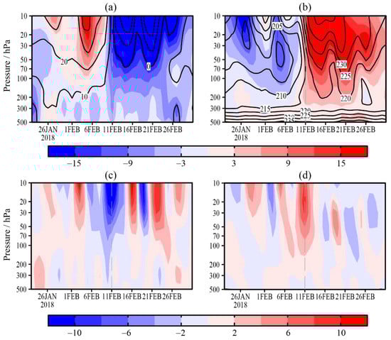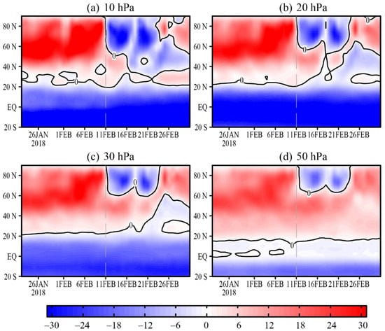 The latitude–time cross sections of the zonal-mean zonal wind (unit: m s−1) during the period 22 January–3 March 2018 at (a) 10 hPa, (b) 20 hPa, (c) 30 hPa, and (d) 50 hPa, respectively.