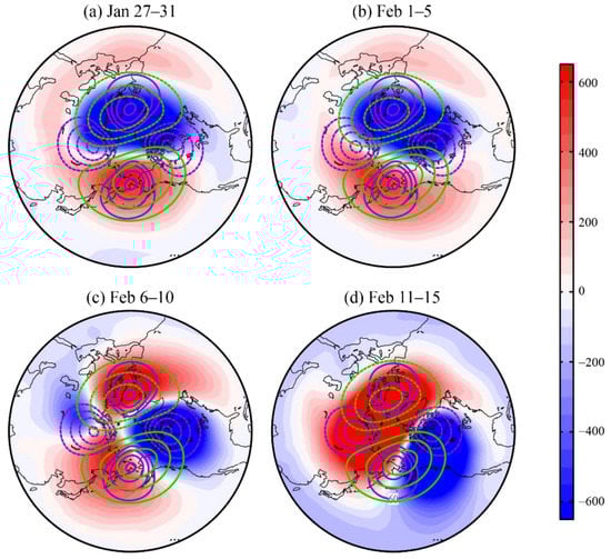 10-hPa geopotential height anomalies averaged over each successive 5 days from 27 January to 15 February (shading, unit: gpm). Light green (purple) contours are the corresponding climatological wavenumber-1 (wavenumber-2) components. The contour levels for wavenumber 1 (wavenumber 2) are successively ± 200, ± 400, and ± 600 gpm (± 60, ± 90, ± 120, ± 150 gpm).