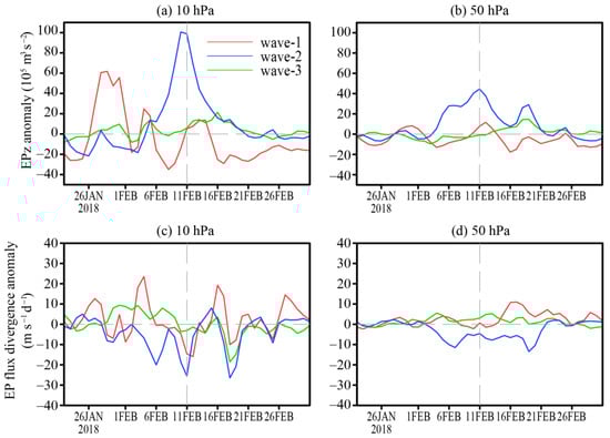 The occurrence of SSW event is caused by the interaction of planetary wave activity and the stratospheric mean flow. According to the dominant planetary wavenumbers (wavenumber 1 or 2) that lead to the breakdown of the stratospheric polar vortex, SSW events can be classified into wavenumber-1 and wavenumber-2 types. Charlton and Polvani [] pointed out that the vortex displacement type and the vortex split type have a good correspondence with planetary wavenumber 1 and wavenumber 2 in the stratosphere, respectively. The following discussion will focus on the characteristics of planetary wave activities during the occurrence of February 2018 SSW. Figure 5 displays temporal evolutions of the vertical component of Eliassen–Palm (EPz) flux anomalies and EP flux divergence anomalies by planetary wavenumbers 1–3 averaged in 55–75° N at 10 hPa and 50 hPa, respectively. It is seen that a burst of wavenumber-1 EP flux appears during the period from 26 January to 1 February. A moderate magnitude of wavenumber-1 EP flux convergence is also found from 29 January to 2 February. This weakens the stratospheric polar vortex to a certain extent causing a minor warming event at 10 hPa (Figure 1 and Figure 5a,c). However, five days before the SSW occurrence, the 10-hPa wavenumber-2 EPz flux increases dramatically, accompanied by a negative anomaly of the wavenumber-1 component. The wavenumber-2 anomaly peaks around the central warming date (Figure 5a). Meanwhile, we see the maximum value of the convergence of wavenumber-2 EP flux on the central date (Figure 5c), implying the occurrence of a wavenumber-2 dominated SSW event.