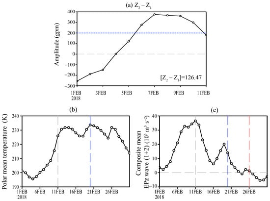 Temporal evolutions of (a) the difference of geopotential height at 50 hPa along 60° N between wavenumber-1 and wavenumber-2 component, (b) the temperature averaged in the polar region (0–360°, 70–90° N) at 50 hPa, and (c) composite means of the EPz flux associated with wavenumber 1 and wavenumber 2 in 45–75° N at 100 hPa. Blue dashed line in (a) marks the 200 gpm. Gray dashed lines in (b,c) represent the onset date of the 2018 SSW event. Blue and red dashed lines represent the date when the maximum temperature in the polar region appears and the sixth day after it, respectively.