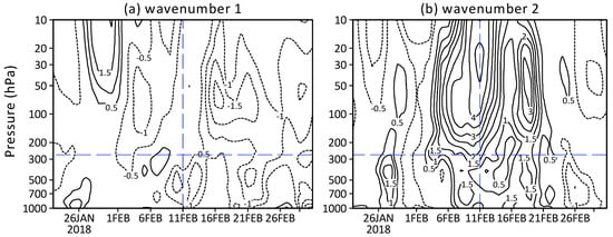 Temporal evolutions of standardized EPz flux in 45–75° N associated with (a) wavenumber 1 and (b) wavenumber 2. Contour interval is 0.5 with zero lines omitted. Vertical dashed lines represent the onset date of 2018 SSW event. Horizontal dashed lines represent the approximate tropopause level.