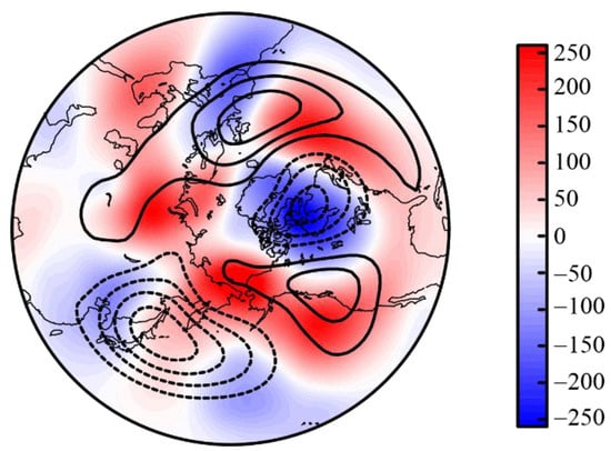 The distribution of geopotential height anomalies at 500 hPa averaged over 10 days (1–10 February) before the SSW onset (shading, unit: gpm). Contours are the zonal deviations of climatological geopotential height in the corresponding period (interval: 50 gpm, zero lines are omitted).