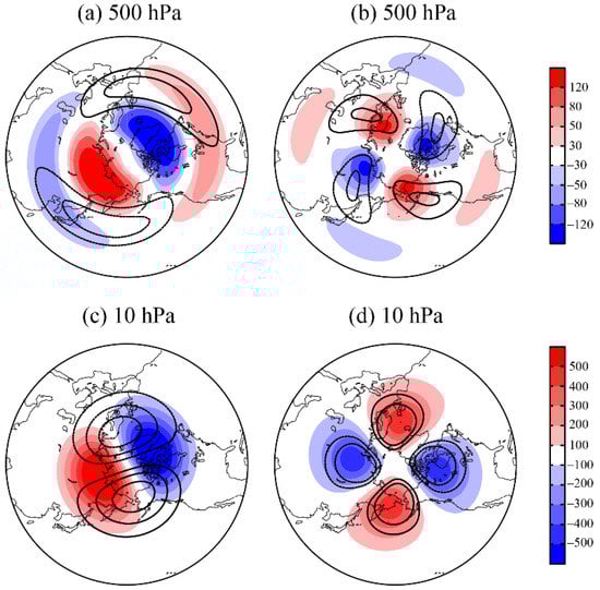 The (a,c) wavenumber-1 and (b,d) wavenumber-2 components of geopotential height anomalies (shadeding, unit: gpm) at (a,b) 500 hPa and (c,d) 10 hPa averaged over 10 days (1–10 February) before the 2018 SSW onset. Contours are climatological wavenumber-1 and wavenumber-2 components in the corresponding period. The contour levels are successively ± 200, ± 400, and ± 600 gpm in (c) and ± 60, ± 90 gpm in (a,b,d), respectively.