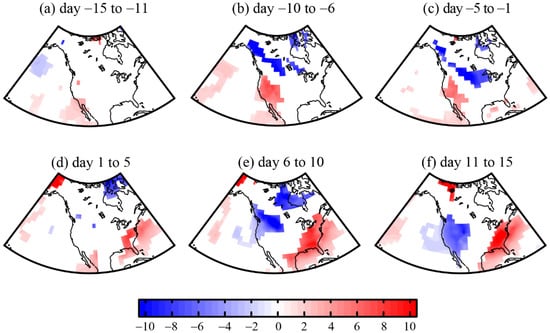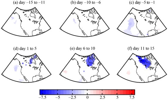 To further confirm the speculation, we revisit the major SSW events in the NCEP–NCAR reanalysis data during the relatively short period 1979–2017. After the onset date, in total seven out of 23 major SSWs feature with the similar mid-tropospheric dipole to the 2018 event. The central dates of the above seven SSWs are 22 February 1979, 26 February 1984, 20 February 1989, 17 December 1998, 11 February 2001, 4 January 2004, and 7 January 2013, respectively. We show the tropospheric circulation pattern in Figure 11b composited by the seven SSWs with respect to the onset dates. As expected after the SSW, an anomalous high-pressure ridge is observed in the mid-troposphere over Alaska and an anomalous low-pressure trough exists in the northeastern North America. This west–east dipole lasts for 15–20 days. Figure 12 shows the composite 2-meter temperature anomalies associated with the seven SSWs. While there is almost no significantly anomalous signals in North American continent within 15 days before the SSW (Figure 12a–c), significantly negative temperature anomalies appear and expand with time in the Northeastern and Central Canada with the emergence of the pronounced mid-tropospheric dipole after the SSW onset (Figure 12d–f). The cold anomalies can last up to 20 days (Figures not shown). It is not difficult to find from the above analyses that cold waves are likely to happen following this type of SSW onset. Although we cannot conclude in this kind of study that it is the SSWs that exert profound impacts on the surface weather over North America, to some extent such coincidence increases the reasonability that the 2018 SSW event could affect the weather in North America through the mid-tropospheric dipole.