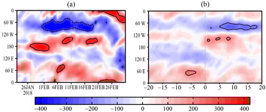Kodera et al. [] discussed the wave activity characteristics after the SSW occurrence. They classified SSW events into two different types based on the propagation direction of the planetary wave after the central date—the absorbing type and the reflecting type. According to the classification, a key date (Dtmax) is defined when the polar temperature at 50 hPa reaches the maximum. On the Dtmax or during its following 6 days, if the composite mean of the wavenumber-1 and wavenumber-2 EPz averaged in 45–75° N at 100 hPa is negative for more than two days, this event is identified as a SSW event of reflecting type, otherwise it is considered as a SSW event of absorbing type. Figure 6b,c shows the temporal evolutions of the temperature averaged in the polar region (0–360°, 70–90° N) at 50 hPa and the composite means of wavenumber-1 and wavenumber-2 EPz flux in 45–75° N at 100 hPa. We see that the highest polar temperature does not occur on the central date. After the SSW, the polar temperature continues to rise. Although the temperature drops somewhat during this period, the highest polar temperature appears on 20 February (Figure 6b). Within the following 6 days, there is only one day when the composite mean of the wavenumber-1 and wavenumber-2 EPz flux is negative (Figure 6c). Therefore, the February 2018 SSW event can be classified as an absorbing type.