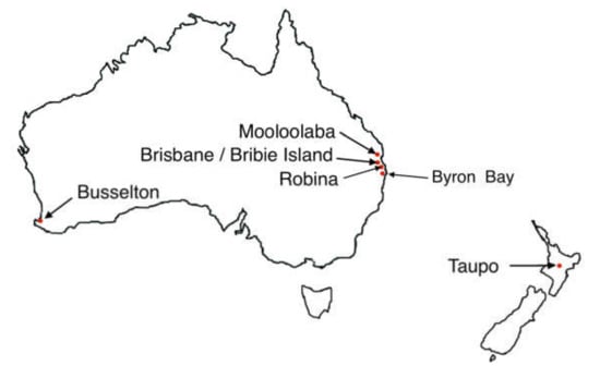 Measurements of personal solar UV exposure for the sport of triathlon were made over three individual training sessions and eight competitive triathlon events contested within Australia and New Zealand between November 2017 and December 2018. Events were contested over Sprint, Olympic, half Ironman and Ironman distances. Triathlon sites included three suburbs of Brisbane (27.5° S 153.0° E): Bribie Island (27.0° S, 153.1° E), Raby Bay (27.5° S, 153.3° E), and Springfield (27.7° S, 152.9° E); four event sites located within Queensland, New South Wales and Western Australia: Mooloolaba (26.7° S 153.1° E), Robina (28.1° S 153.4° E), Byron Bay (28.6° S, 153.6° E), and Busselton (33.7° S, 115.3° E); and one site located in New Zealand: Taupo (37.7° E 176.1° E). The location, event type, local starting time of each triathlon stage and event date are listed in Table 2. Minimum and maximum temperature recorded in the 24-hour period of each event [17,18] and MODIS Terra cloud fraction expressed in octa (eighths) [19] are also listed in Table 2. Event locations are shown in Figure 1.