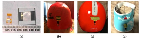 Polysulphone film dosimeters used in this study were adhered to small flexible frames notably smaller than badges used in similar studies (a), that were pinned to the swimming cap (b), bicycle helmet (c) and cap (d) of each participant.