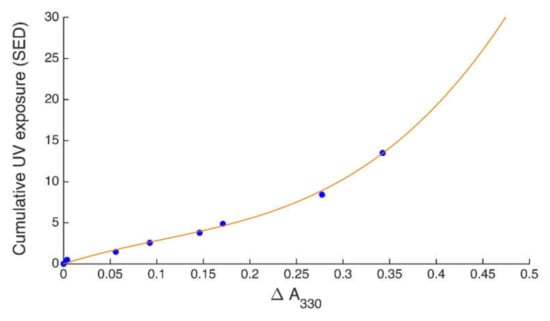 In Equation (1), K is a constant that is dependent upon calibration to a local field radiometer. In the absence of a local radiometer, personal dosimeter exposures were expressed here relative to , where represents the measured change in PS absorbance at 330 nm for field dosimeters placed upon a horizontal plane for the duration of each triathlon event. The constant K is eliminated when deriving the RSE (Equation (2)), which in turn can be expressed as a percentage of the local ambient erythemally effective UV,