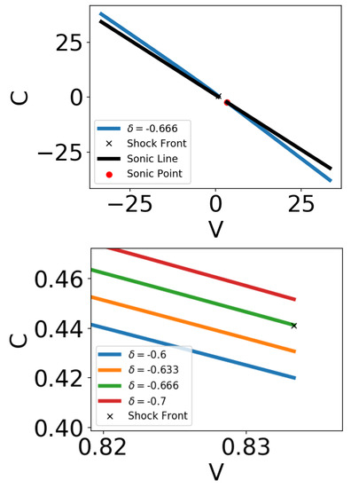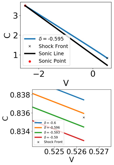Knowing the boundary conditions and , we can integrate from the sonic point to the shock front, as shown in Figure 1. The starting point is slightly shifted from the sonic point in the positive V direction by and in C direction by for some small . The slope at the sonic point is given by the equation: