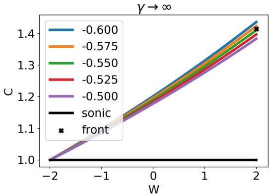 The impulsive piston problem was originally developed and solved in [25,27,28,29,30,31]. The authors reduced the hydrodynamic partial differential equations to ordinary differential equations, and used a multidimensional shooting method to determine . In contrast, the variables we chose allow us to reduce the problem to a single ordinary differential equation, but it comes at a cost. The cost is that we introduce a coordinate singularity, i.e., a place where the dimensional variables remain finite, but the dimensionless variables diverge. The price that we have to pay for this choice is that, for some range of values for the adiabatic index , the numerical integration is not continuous.