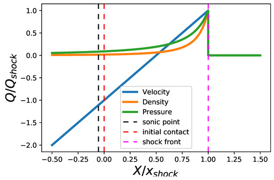 We can see that, at the shock front, where , the dimensionless velocity and speed of sound are , , as verified by the coordinates of the black X in the second graph of Figure 2. We also note that diverge as . From the shooting method, we obtain , which is consistent with the results in Figure 2. The velocity, density and pressure profiles, normalized to their respective quantities at the shock front, are shown in Figure 5.