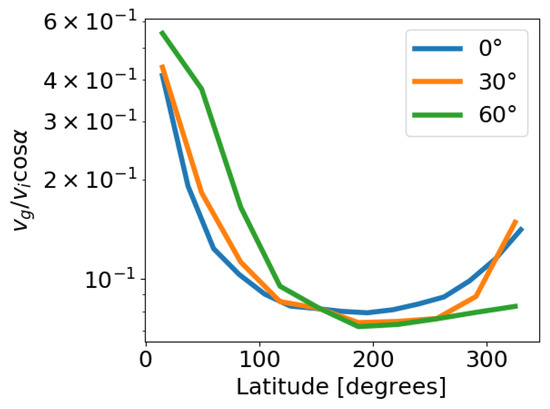 Ground velocity ratio (ground velocity divided by the normal of impactor velocity) from the shock as a function of the position of the planet, for three different colliding angles. The ratio between the impactor and target radii is 0.01. The fact these curves are similar to one another demonstrates that in the self similar shocks lose some of the information about the initial conditions.