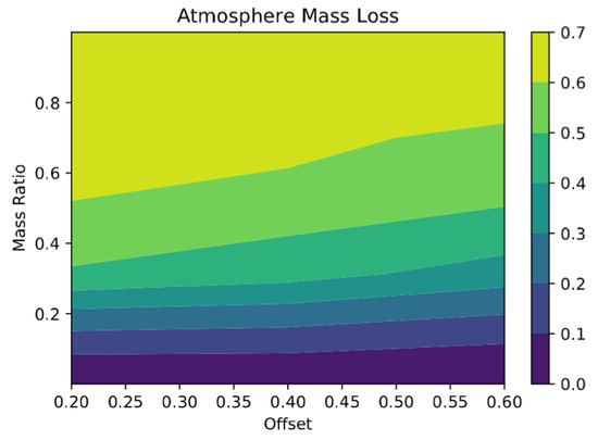 As the shock moves through the planet, it moves the ground, which pushes against the atmospheric gas column above it. In this sense, the ground acts as a piston, which sends a shock that moves up and away from the ground, accelerating due to the declining atmospheric mass density. The mass loss from each gas column as a function of ground velocity was worked out by Schlichting et al. [14]. By integrating the local atmospheric loss across the entire surface, we can obtain the total atmospheric mass loss. By running the simulation with different impact parameter (or offset) and different impactor to target radius ratios (but fixed velocity, which we set to be 1.5 times the escape velocity), we obtain a map of atmospheric mass loss shown in Figure 8. One of the interesting features of this map is that, for small impactors, the offset has very little influence on the outcome. This is because small enough impactors deposit all their energy in the target regardless of obliquity. This trend is in agreement with the findings of Yalinewich and Schlichting [15], who showed that, when the shock radius is considerably larger than the size of the impactor, the shock wave tends to the self similar solution found in the previous section, and in the process loses some of the information about the initial conditions (i.e., fast and small impactors create the same shock wave as slow and big impactors). The loss of information about the initial conditions is a common consequence of self similar solution [21].