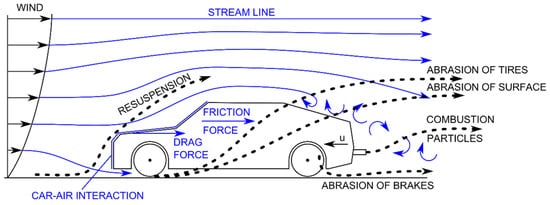 For descriptive purposes we can point out that combustion-generated particles result from the complex physico-chemical transformations that constitute the combustion process []. Such particles then shape and are carried in the flow of waste gases emitted from automobile exhaust pipes. Other instances of particulate matter include relevant products of brake, tire, and roadway abrasion and resuspension of the particulates deposited earlier. In all size categories, the mass concentration of the particles markedly decreases with increasing distance from the road []. The dispersion into the environment is influenced particularly by the character of the air velocity field in locations near the roadside. The actual mass concentration is then affected by, among other aspects, the particulate deposition, resuspension, and interaction with solid surfaces and vegetation. By extension, concurrently with these processes there occurs partial physical changes in the particulate matter due to collisions between and growth of the particles; on a lesser scale, the particulates also undergo chemical and photochemical transformations.
