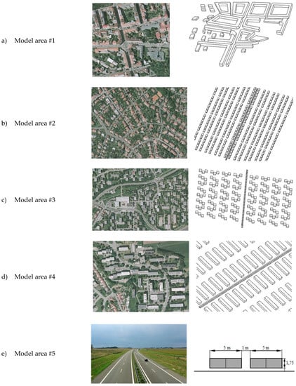 The research involved converting into specific numerical models five classic types of built-up urban lands adopted from various locations within the city of Brno (CZ); collectively, these sample regions occupy an area of 1000 × 1000 m2. The real land patterns are substituted with a horizontal surface. The center of each model area is intersected by a straight, four-lane road carrying two-way traffic, with two lanes in each direction. Real geometry-based buildings are assumed to be present in the vicinity of the road, and their positions correspond to the real-world layout obtained through processing the ground plan view contained in the geodetic survey map of the relevant urban district. Progressively, the following numerical models were designed (for the images, see Figure 2):