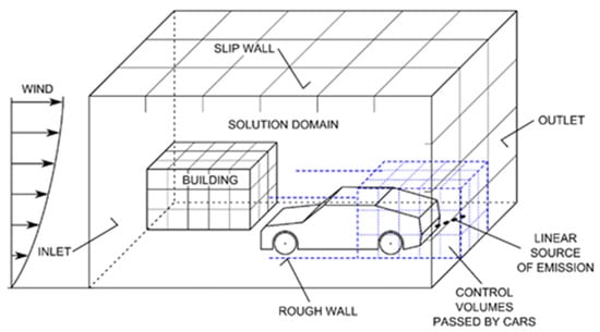 This paper discusses in detail the dispersion of particles from a road into differently configured urban environments. Modeling via the control volume method (computational fluid dynamics, CFD) embodies the most suitable tool for detailed identification of an air velocity field in urban areas. This software approach enables the computation process to cover geometrically complex zones (such as built-up urban land) and to capture the effect of cars traveling along the road. The vehicles drag with them the air from the immediate vicinity, creating an air flow that moves in their driving direction, and they generate multiple turbulent vortices that substantially influence the dispersion of particles in the region closely adjacent to the vortices‘ source []. The elevated turbulence then exerts an impact on the air flow and its interaction with solid surfaces (see Figure 1).