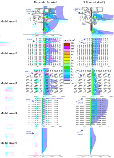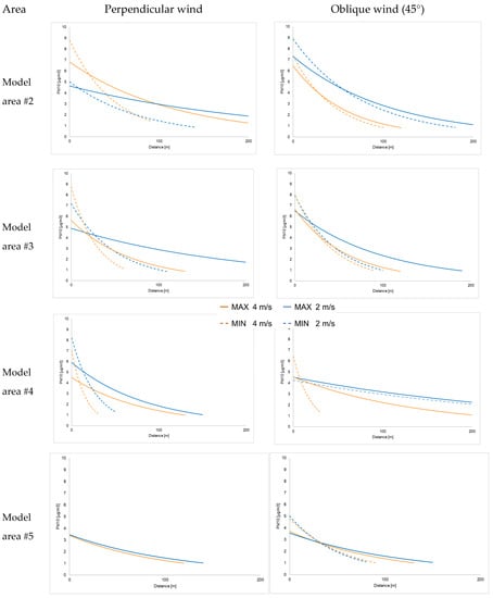 Figure 4 displays the computed PM10 mass concentration fields acquired in a horizontal plane running at 1.5 m above the ground; such a height corresponds to the human breathing level. The mass concentration fields are specified for the perpendicular and oblique (45°) wind directions, assuming the wind speed of 2 m·s−1.