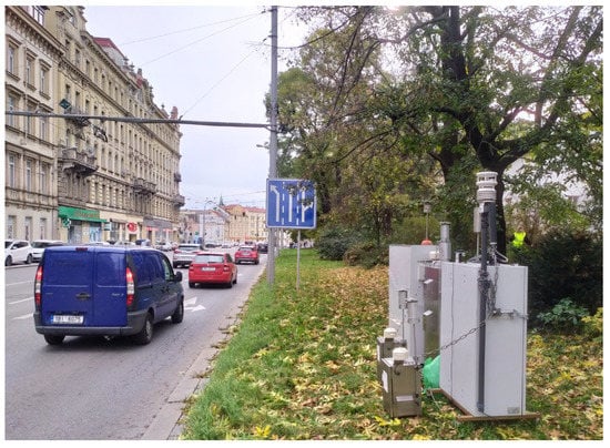The correctness of the inclusion of a linear source of PM10 emissions in the numerical model is crucial for the subsequent realistic solution of the particle dispersion. The validity of the emission factor was verified via the results of in-situ measurements at close vicinity of the studied road. To verify the correctness of the linear emission source calculation, the numerical predictions were compared with concentrations acquired via the in-situ measurements performed to determine the concentrations of the PM10 at the central district of Brno. The measurement spot was located in close proximity to a convenient portion of the city’s ring road (see Figure 6). On the side opposite to this spot, the road runs along a continuous formation of five-storey buildings; on the measurement side, however, the main urban element is a city park with lawns, shrubbery, and sparsely planted trees.
