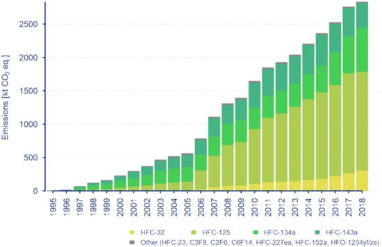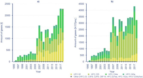 In the national inventory, mixtures are compartmentalized into individual gases. The trend of use of particular F-gases is depicted in Figure 1. As can be seen, there was a significant decrease in the use of HFC-125, and HFC-143a even did not appear in the market in 2018. These two gases have high GWP, and their decrease is based on the fact that manufacturers are preparing for limitation of these gases and their mixtures. As can be seen on the second graph in Figure 1a,b, although the amount of F-gases used in 2018 is similar to in 2017, the used gases have a smaller impact on global warming.