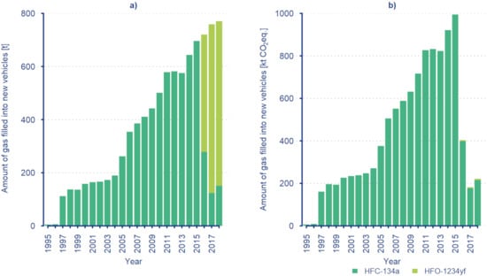 The only refrigerant used for mobile air conditioning from 1995 to 2015 was HFC-134a (GWP 1300 [4]). Since 2015, it has been prohibited to use this gas in mobile air conditioning and manufacturers have started filling cars for the EU market with hydrofluoroolefin (HFO)-1234yf and this gas has been the main refrigerator in mobile air conditioning since then. This change is the result of implementation of the MAC Directive. It is assumed that HFO-1234yf will not be replaced by some other refrigerant in next few years, so its consumption will depend solely on the number of cars produced. As can be seen from the second graph in Figure 2a,b, the impact of HFO-1234yf on global warming is more than thousand times smaller than the impact of HFC-134a. More detailed comparison of these two gases is presented in the following section.