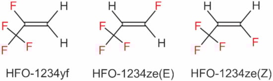 HFO-1234ze has two isomeric structures: trans-1, 3, 3, 3-tetrafluoroprop-1-ene with suffix (E) or cis-1, 3, 3, 3-tetrafluoroprop-1-ene with suffix (Z) [20]. The suffixes are abbreviations of the German words Entgegen (E, opposite) and Zusammen (Z, together) [21]. HFO-1234ze(E) is used more often because of its similarity to its predecessor HFC-134a.