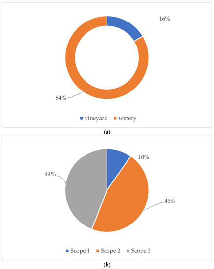 (a) Contribution of the vineyard and the winery to the total emissions (total = 99,586 kg CO2-eq). (b) Emissions per scope category. Scope 1: emissions controlled by the winery (9685 kg CO2-eq); Scope 2: electricity purchase from the national network (45,993 kg CO2-eq) and Scope 3: factors controlled by others (e.g., vinegrowers, waste management—(43,908 kg CO2-eq)).
