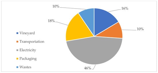 Most of the SME wineries in Cyprus use buildings that are not energy efficient and under the hot summer and autumn months, when the wine is stored in the tanks under controlled temperature, the demand for electricity increases. Consequently, electricity use is the first hotspot for the Xynisteri wine CF (Figure 3; 46%). Energy analysis and improvement of the energy efficiency in wine production could be a reasonable target for CF reduction. The installation of photovoltaic panels could (indirectly) reduce the use of electrical energy and the CF. In addition, technologies that reduce the energy consumption by the coolers and lighting systems could further reduce the CF.
