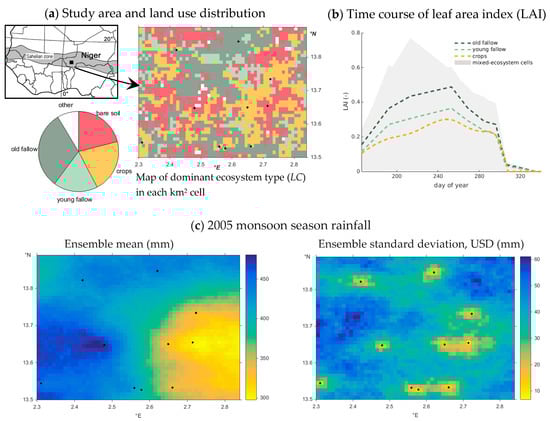 Characteristics of case study: (a) location of the study area and spatial distribution of ecosystem types (LC)—bare soil, crops, young fallow, old fallow, other—in 2005 in study window, derived from eight-entry classification as explained in Section 2.3 (map displays dominant LC per cell whereas pie accounts for all LCs in each cell); (b) seasonal course of leaf area index through the 2005 simulation period: spatial mean for each vegetated LC (dash lines) and spatial range for the mixed-LC, ~1-km2 cells (shaded area); (c) maps of 2005 total precipitation: ensemble mean (left) and standard deviation (right, hereafter denoted as “standard uncertainty” USD) from stochastic rainfall modeling in study window (see Supplementary Material for sample rainfields from the simulation ensemble). Black dots in (a,c) show raingauge locations (rainfall simulation uses more raingauges outside the study window). Spatial coordinates in decimal degrees East and North.