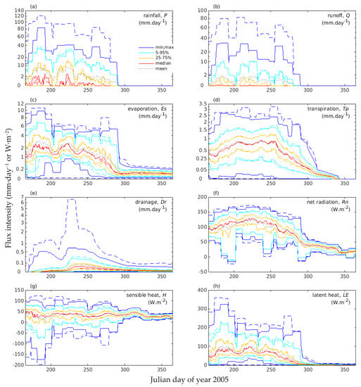 Flux types analyzed in this study were (i) for the water cycle: rainfall P, runoff Q, direct soil evaporation Es, and plant transpiration Tp (henceforth abbreviated to evaporation and transpiration, and summing to evapotranspiration), as well as drainage Dr; and (ii) for the energy cycle: net radiation Rn, sensible heat flux H, and latent heat flux LE. Ground heat flux was considered as less significant at timescales analyzed here, hence it is not presented. Direct canopy evaporation is quite negligible in this environment [22]. Evapotranspiration and latent heat flux are equivalent modulo the unit latent heat of vaporization. Whenever possible in the figures, water and energy fluxes are displayed together on the same graphs using this conversion factor.