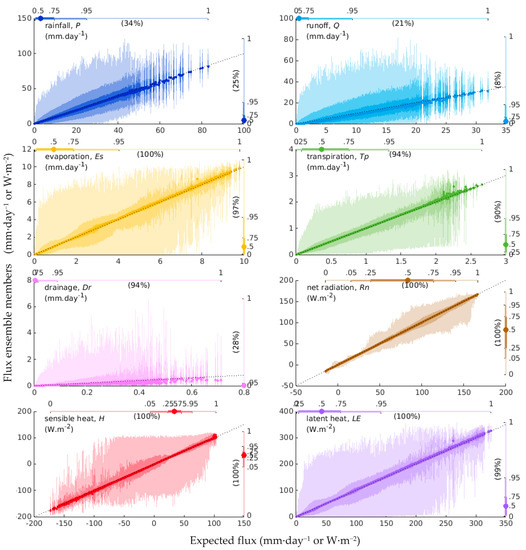 Quantile-based frequency distributions of cell/day-scale water and energy fluxes for ensemble means (expected fluxes; horizontal axis) and members (vertical axis), for each flux type. The inner 2-D plot in each graph shows distributions of ensemble members conditional to means; marginal distributions of means and members are shown along the top and right edges, respectively (for legibility, they apply to the specified fractions (%) of non-nil values in the full series). Median, quartiles, upper and lower 5%, and min/max, are displayed with 4-level decreasing color intensity and are labeled explicitly for marginal distributions (see, e.g., those for Rn for color intensity legend). The 1:1 black dotted line sets the ensemble mean for any conditional ensemble members’ distribution. Conditional distributions are computed within 1000 slices covering the range of ensemble means.