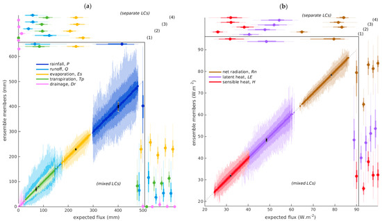 Frequency distributions of time-integrated, cell-scale water (a) and energy (b) fluxes, for ensemble means (horizontally) and members (vertically) in mixed-ecosystem cells (inner rectangles, same as Figure 3) or conditioned to individual ecosystem types (top and right outer areas for means and members, resp.). Inner rectangles: 2-D plots of members conditioned to mean and 1-D marginal distributions (see Figure 3). Smaller gray-scaled distributions superimposed to 2-D clouds represent corresponding spatially-(beside temporally-) integrated fluxes. Outer areas: individual ecosystem types (LCs) are 1 = bare soil, 2 = crops, 3 = young fallow, 4 = old fallow. All distributions are displayed as quantiles (median, quartiles, upper and lower 5%, and min/max) with 4-level decreasing color intensity, as in Figure 3. Graphs are drawn with square-scales.