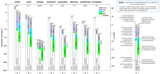 Three-factor (time ‘t’, space ‘xy’, uncertainty ‘e’) decomposition of total variance for ensemble, fully-resolved water, and energy fluxes. Uncolored segments refer to 1st-order components for each factor, while colored segments represent higher-order terms, i.e., interactions between factors as defined at the top right corner in graph box and explained in the legend column (right). Note that variances are displayed log-scaled, hence distorting the equality of interaction terms shared by interacting factors—to the point that some segments may not be clearly visible for all factors (see e.g., the time factor, left bars). All variances are expressed in (mm·day−1)2 on the left axis and inside graph box, and in equivalent (W·m−2)2 on the right axis. Component values are written vertically inside or to the right of one instance of each component segment; total variance for each factor is displayed horizontally above the corresponding full bar; entire variance for each flux type (sum of one instance of each of the seven component terms) is displayed at figure top, below flux type name. Italic percentages in first-order segments for space factor (central bars) give a further decomposition of these terms between spatial rainfall and ecosystem effects, respectively (interactions of the two effects are very small for all variables but Dr (20% of total), and were split equally between them).