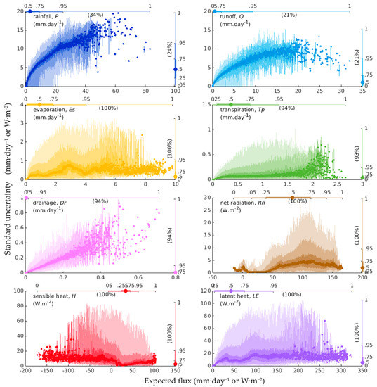 Except for Rn, uncertainties in daily fluxes (Figure 3 and Figure 6) generally tend to be comparatively lower for the most frequent flux magnitudes (see, e.g., the case of H).