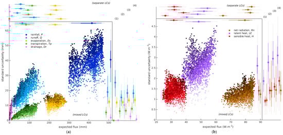 Elemental standard uncertainty (USD) for time-integrated, cell-scale water (a) and energy (b) fluxes. Inner boxes show USD versus expected flux in all cells (2-D plots, one point per cell) as well as marginal frequency distributions of USD (quantile whiskers, on the right within the box) and expectation (on the top within the box), in mixed-ecosystem cells. Color darkness in scatterplots maps the rainfall uncertainty coefficient (UC) in each cell. Vertical (horizontal) whiskers in the right (top) outer area represent quantiles of USD (expectations) for individual ecosystem types (LCs; 1: bare soil; 2: crops; 3: young fallow; 4: old fallow), similarly to Figure 4. Quantile display conventions are as in Figure 3.