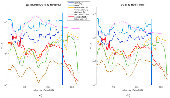 Time course of 10-day scale flux uncertainty coefficients (UC), for (a) cell (with spatial lumping of UC), or (b) meso spatial flux scales.