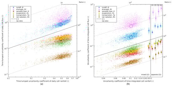 Using again the UC dimensionless measure, Figure 9 displays the spatially-variable (one point per cell) relationship to rainfall uncertainty of all water and energy flux uncertainties, for daily-scale fluxes (time-lumped measure, Figure 9a) or half-year fluxes (Figure 9b). On both graphs, diagonal projection to the right or top graduated axes provides the ratio of the two confronted UC values, i.e., the corresponding UC propagation factor. For time-integrated fluxes (Figure 9b), quantile distributions of the propagation factor are also drawn on the right side of the graph (with diagonal reading), for the mixed-ecosystem cells as well as for individualized ecosystems.