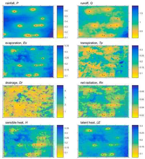 The maps in Figure 10 illustrate how the spatial patterns in time-lumped UC of daily-scale P propagate to the other flux types. The marked pothole structure of P uncertainty is largely preserved for Es and LE as well as for H, Rn, and Q and to a lesser extent for Tp, but is considerably blurred in Dr.