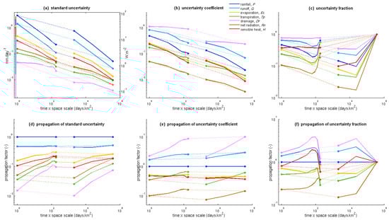 Finally, for any flux type at any scale and any time-lumped uncertainty measure, a propagation factor—from rainfall to that flux type—is defined as the ratio of that measure to the same measure for rainfall (see formulae in Appendix B).