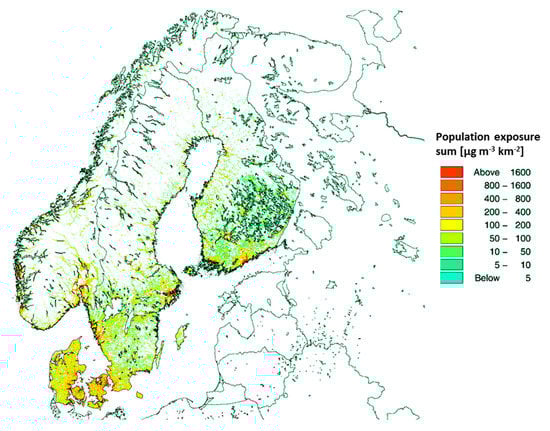 A review by Papadogeorgou et al. (2019) [] related to health effects of fine particles at low exposure levels report statistically significant associations between long-term fine particle exposure and total mortality as well as mortality due to cardiovascular diseases and respiratory diseases. In the Nordic countries, annual ambient air pollution levels are relatively low, and generally meet the EU guideline values. Regardless of the low exposures, ambient air pollution remains a significant environmental risk factor in Nordic countries. For instance, in Sweden and Finland, 7600 and 2000 premature deaths, respectively, were attributable to air pollution in 2015 [,]. Premature deaths attributable to air pollution are leading to considerable economic costs. In four Nordic countries (Denmark, Sweden, Finland and Norway), air pollution related deaths were estimated to lead to a total cost of 7 billion euros in 2015 [].