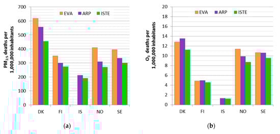 Deaths attributable to (a) PM2.5 and (b) O3 exposures in the Nordic countries per million inhabitants. The results for Economic Valuation of Air Pollution (EVA) tool include acute deaths in addition to chronic deaths for PM2.5.