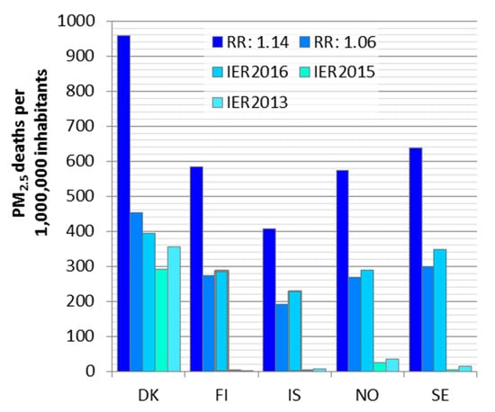 We found large differences between the deaths attributable to PM2.5 estimated with different C-R functions in the Nordic countries (Figure 3). These estimates varied from 1800 to 18,000 deaths in the Nordic area (Table 7). Use of the RR 1.14 [] naturally more than doubled the deaths compared to those estimated with RR 1.06 recommended by the WHO expert panel []. Use of IER2016 resulted in estimates close to estimates calculated with the RR: 1.06. The previous IERs from GBD studies 2013 and 2015 substantially decreased the estimated attributable deaths. There were only a few estimated deaths for Finland and Iceland, when IER 2013 or 2015 were used (Table 7). In Denmark with the highest PM2.5 concentrations of the Nordic countries (9.2 µg/m3), differences between the IER functions were smaller as the mean PM2.5 concentration was not close to the theoretical thresholds.