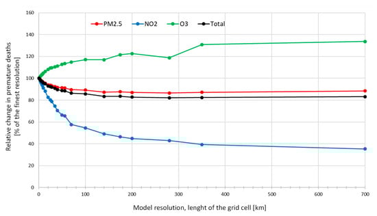 The numbers of deaths attributable to air pollution were estimated for the resolution change. In this part of the study we included NO2 to represent a locally variable species. The C-R function used for NO2 is based on the HRAPIE recommendation (RR: 1.0027 for short term exposure and RR: 1.055 for long-term exposure, applying a 20 µg/m3 lower limit value) []. By this, we are not testing the impact of using different types of air pollution models with different resolution, but the pure numerical effect of representing the air pollution concentrations on different resolutions giving artificial numerical diffusion and therefore giving lower air pollution levels (higher for ozone) in the highly densely populated areas, compared to the high resolution case.