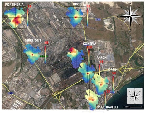 - Amodio, M.; Andriani, E.; Dambruoso, P.R.; de Gennaro, G.; Di Gilio, A.; Intini, M.; Palmisani, J.; Tutino, M. A monitoring strategy to assess the fugitive emission from a steel plant. Atmos. Environ. 2013, 79, 455–461. [Google Scholar] [CrossRef]