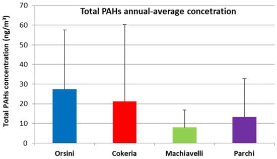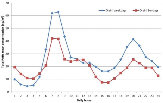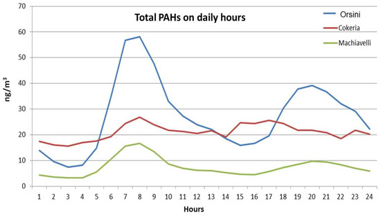 Moreover, the daily profile of total p-PAH hourly concentrations at the Orsini site showed high values from 6 to 10 a.m. (maximum equal to 57.2 ng/m3) and from 6 to 9 p.m. (maximum equal to 38.9 ng/m3); thus, due to the traffic flow in the morning rush hours [15]. The same trend was obtained for the Machiavelli site in the urban settlement while a constant trend was registered for the industrial Cokeria site (Figure 4).