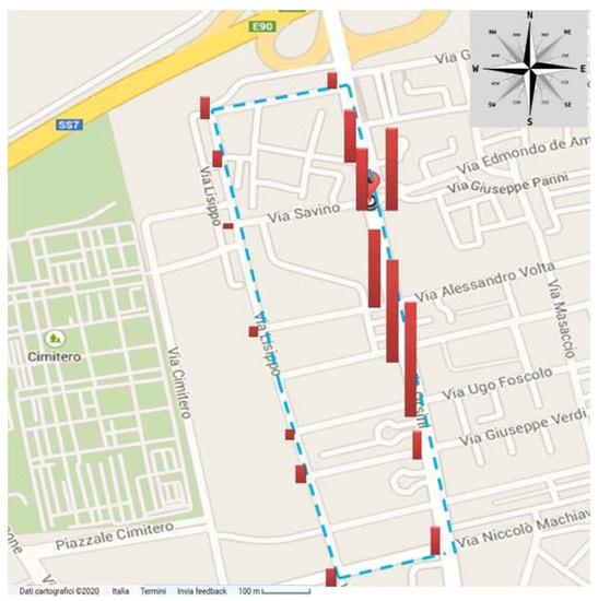 Therefore, in order to explain the observed unexpected values and confirm the preliminary hypothesis of the existence of the additional traffic source at the Orsini site, a mobile monitoring experiment was ad-hoc designed and performed on-field by using a total p-PAHs analyzer placed onto a cart. The mean value of all the experimental data collected at the 17 pit stops (one at each street corner along the pathway) are reported in Table 2 and visualized on the map in Figure 6.